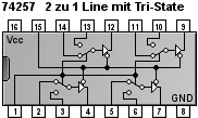 Ein 4-Bit Bus A sowie ein 4-Bit Bus B sind die Dateneingänge. Mit dem Selektor an Pin 1 wird bei 'Low' der Bus A und bei 'High' der Bus B an den 4-Bit Ausgangsbus Y geschalten. Zusätzlich kann über ein 'High' an Pin 15 der Ausgangsbus hochohmig geschalten werden, so dass durch den Ausgang kein Strom fließen kann.