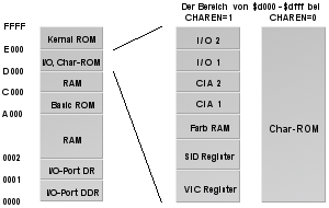 Der 6510 kann mit seinen 16 Adreßleitungen 64KB linear adressieren. Mit Hilfe eines speziellen PAL-Bausteins im C64 können über die Leitungen des 6510-I/O-Ports und über Steuersignale am Erweiterungsport viele verschiedene Speicherkonfigurationen eingestellt werden (siehe dazu [3]). Hier soll jedoch nur die Standardeinstellung beschrieben werden. Die anderen Konfigurationen ändern die Lage der verschiedenen Bereiche nicht, sondern blenden nur zusätzliche Bereiche des Hauptspeichers ein.