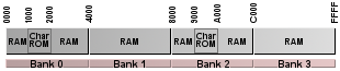 Der VIC besitzt nur 14 Adreßleitungen, kann also nur 16KB Speicher adressieren. Er kann trotzdem auf die kompletten 64KB Hauptspeicher zugreifen, denn die 2 fehlenden oberen Adreßbits werden von einem der CIA-I/O-Chips zur Verfügung gestellt (es sind dies die invertierten Bits 0 und 1 von Port A der CIA 2). Damit kann jeweils eine von 4 16KB-Bänken für den VIC eingestellt werden.
