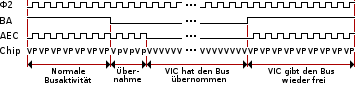 Die Aufteilung der Zugriffe zwischen 6510 und VIC ist zunächst einmal statisch: Jeder Taktzyklus (eine Periode des ø2-Signals) ist in zwei Phasen aufgeteilt. In der ersten Phase (ø2 Low) greift der VIC zu, in der zweiten Phase (ø2 High) der Prozessor. Das AEC-Signal schwingt parallel zu ø2 mit. So könnten 6510 und VIC beide abwechselnd den Speicher benutzen, ohne sich gegenseitig zu stören.
