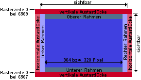 Allerdings beschränkt sich die im Randbereich darstellbare Grafik hauptsächlich auf Sprites, da der Grafikdatensequenzer in diesem Bereich im Idle-Zustand ist, da außerhalb der Y-Koordinaten $30-$f7 keine Bad Lines auftreten können (siehe Abschnitt 3.5.). Man kann aber auch mit der im Idle-Zustand erzeugten Grafik etwas sinnvolles darstellen.