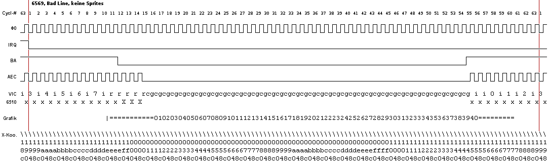 Jedoch benötigt der VIC manchmal mehr Zyklen, als dieses Schema ihm zuteilen würde. Das ist dann der Fall, wenn der VIC auf die Zeichenzeiger und auf die Sprite-Daten zugreift. Im ersten Fall werden 40, im zweiten Fall pro Sprite 2 zusätzliche Zyklen benötigt. Dann geht BA 3 Zyklen bevor der VIC den Bus komplett übernimmt auf Low (3 Zyklen sind die maximale Anzahl aufeinanderfolgender Schreibzugriffe beim 6510) und nach 3 Zyklen bleibt AEC während der zweiten Taktphase Low, damit der VIC seine Adressen anlegen kann.