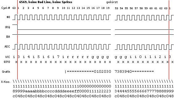 Die Zeile Chip gibt an, welcher Baustein gerade auf den Bus zugreift (es findet ja, wie gesagt in jedem Zyklus ein Zugriff statt). V steht für den VIC, P für den 6510. Die mit p gekennzeichneten Zugriffe des Prozessors werden nur ausgeführt, wenn sie Schreibzugriffe sind. Der erste p-Lesezugriff hält den 6510 an, spätestens nach dem dritten p, da ja beim 6510 höchstens 3 Schreibzugriffe aufeinanderfolgen können. Bei einem p-Lesezugriff werden aber trotzdem die Prozessoradressen auf den Bus gegeben, denn AEC ist ja noch High.